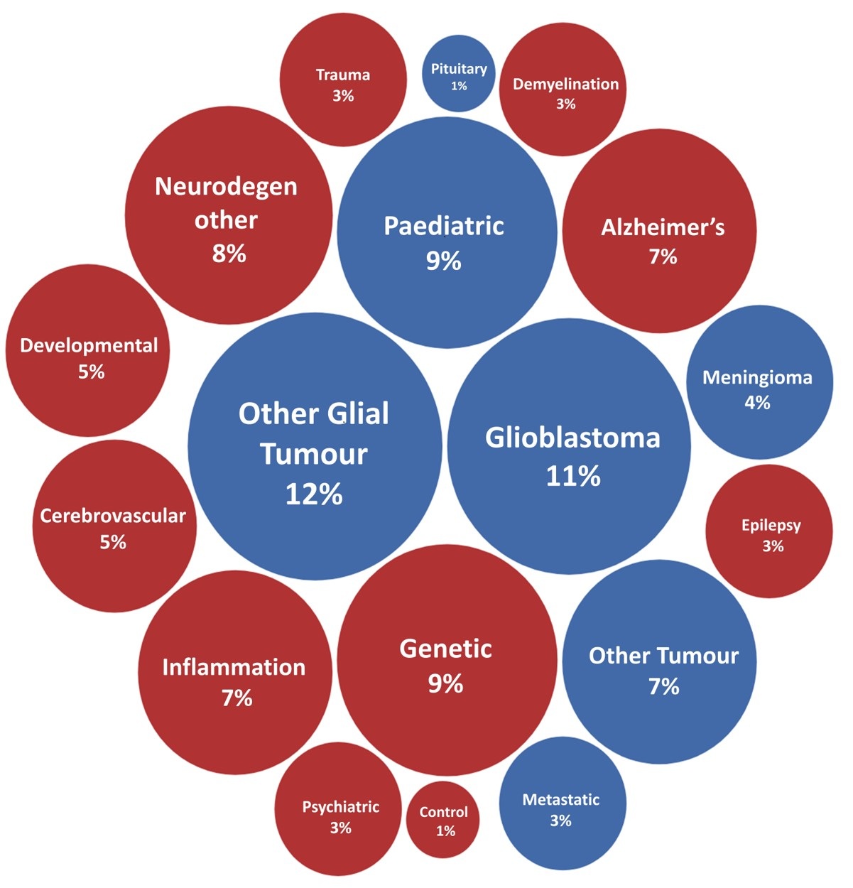 Our Participating Centres maintain dynamic collections of a range of human tissues/materials derived from diagnostic Neuropathology practice, especially tumours. These are mainly from the brain, spinal cord, meninges, skull, spine, associated soft tissues, peripheral nerve and muscle. Less frequently sampled structures include the eye and related structures, skin and other organs/tissues in relation to neurological disease.
